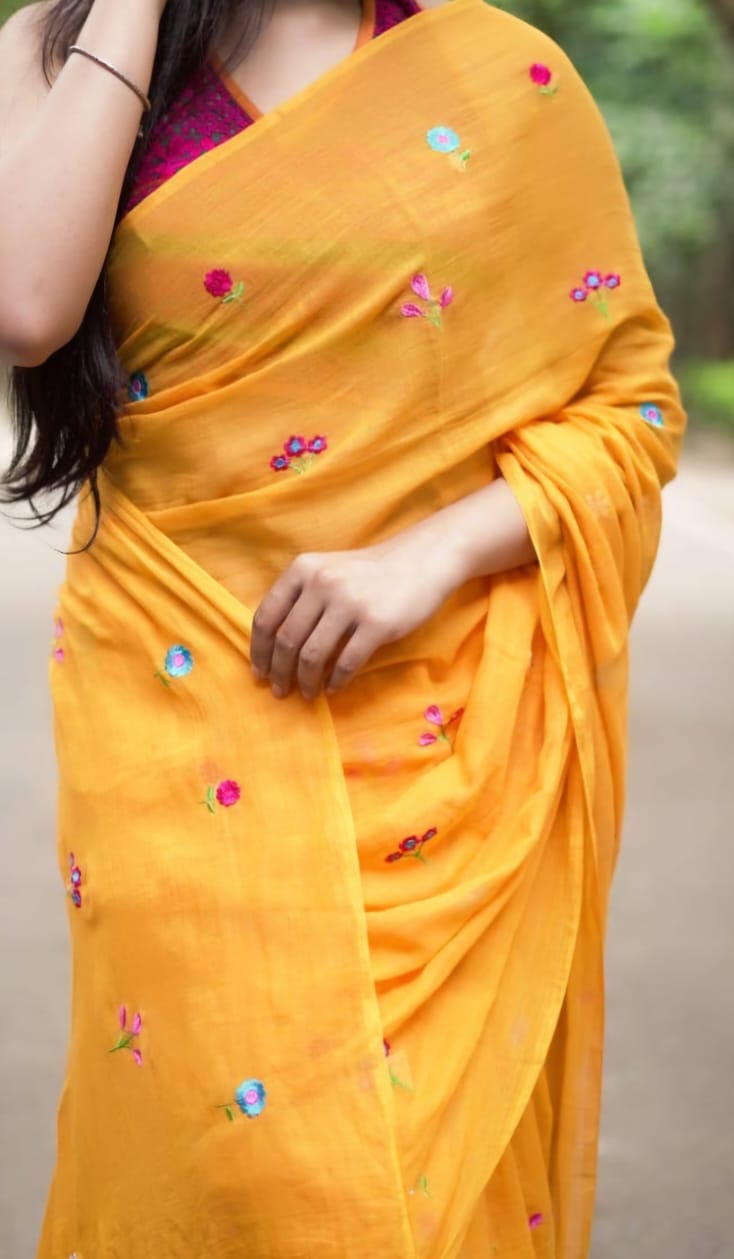 This charming mul cotton embroidered  saree from Kreton Galph is 5.5 metres long and does not come with a blouse piece.