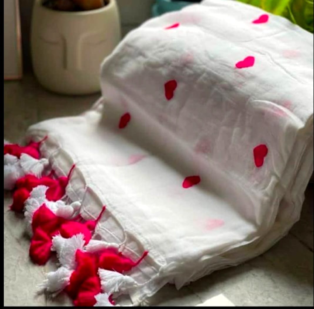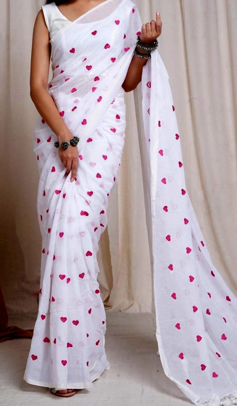 This charming mul cotton embroidered saree from Kreton Galph is 5.5 metres long and does not come with a blouse piece.