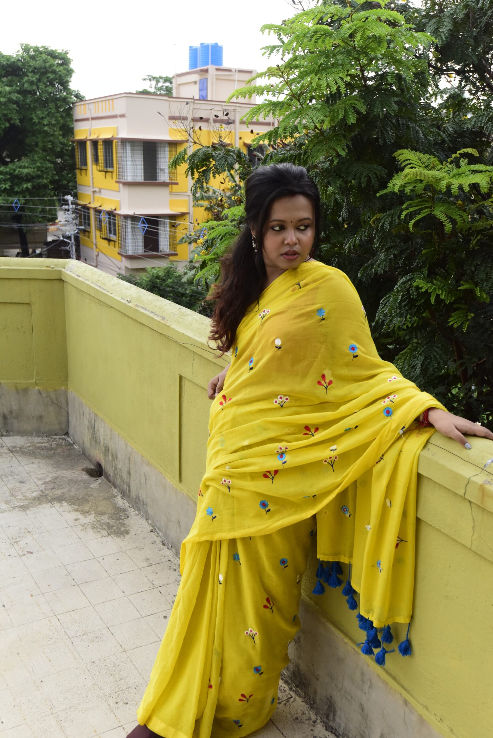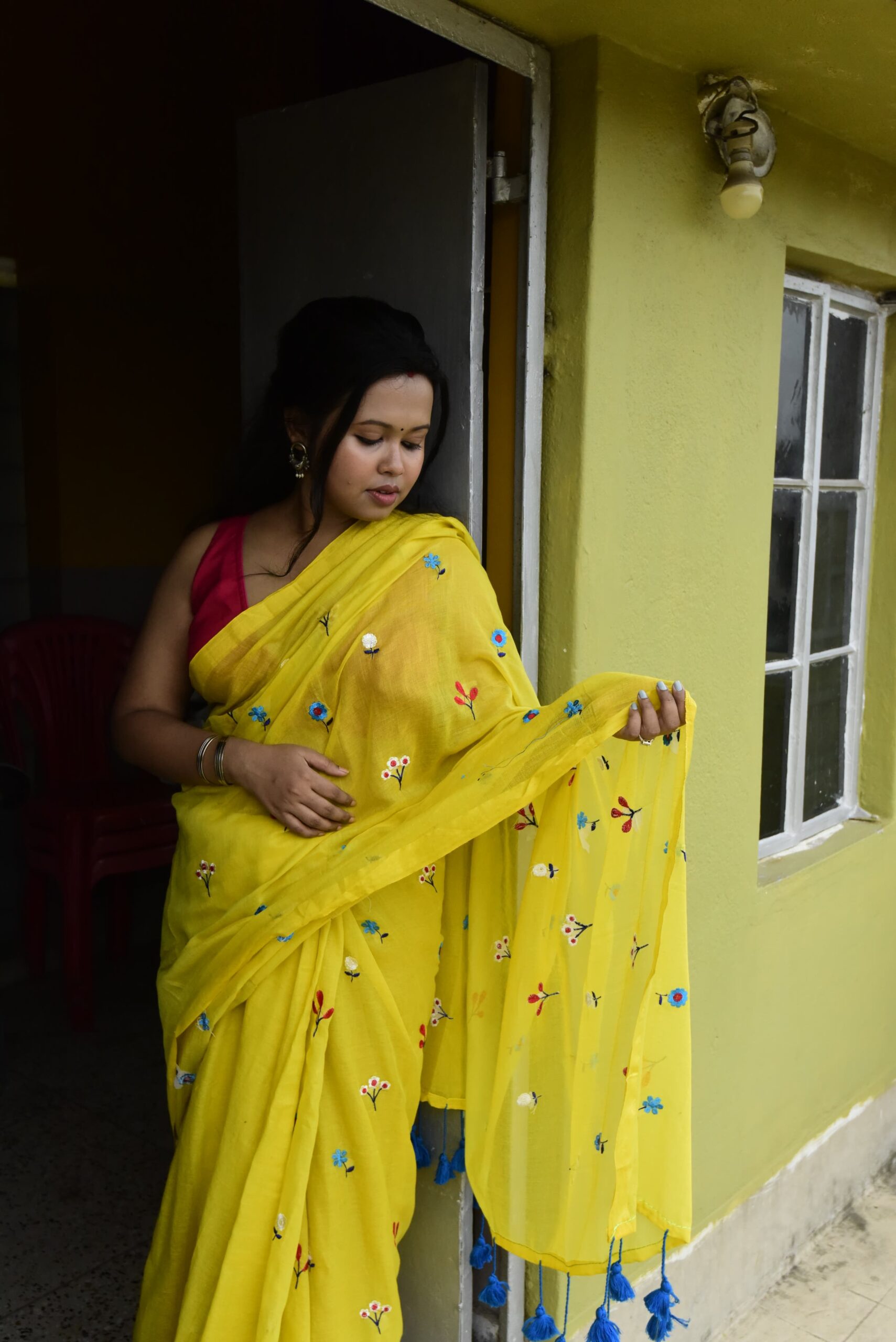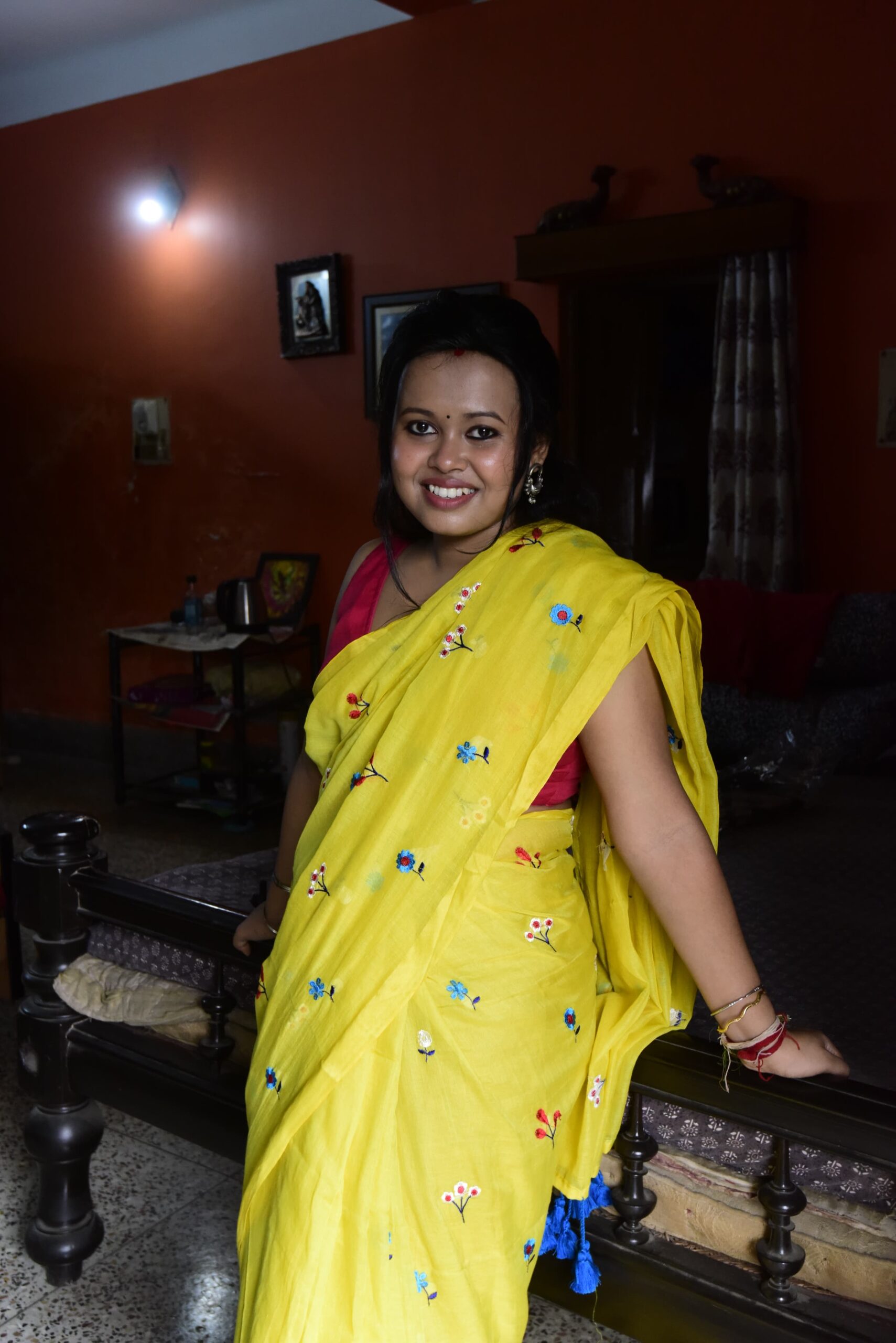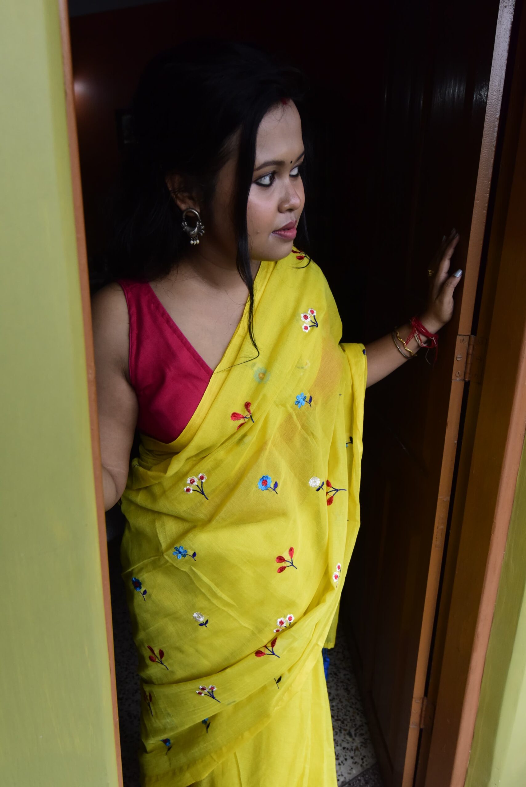 Soft mul cotton saree with delicate embroidery work, lightweight and breathable for all-day comfort. Elegant drape suitable for casual, office, or festive wear. Comes without blouse piece.