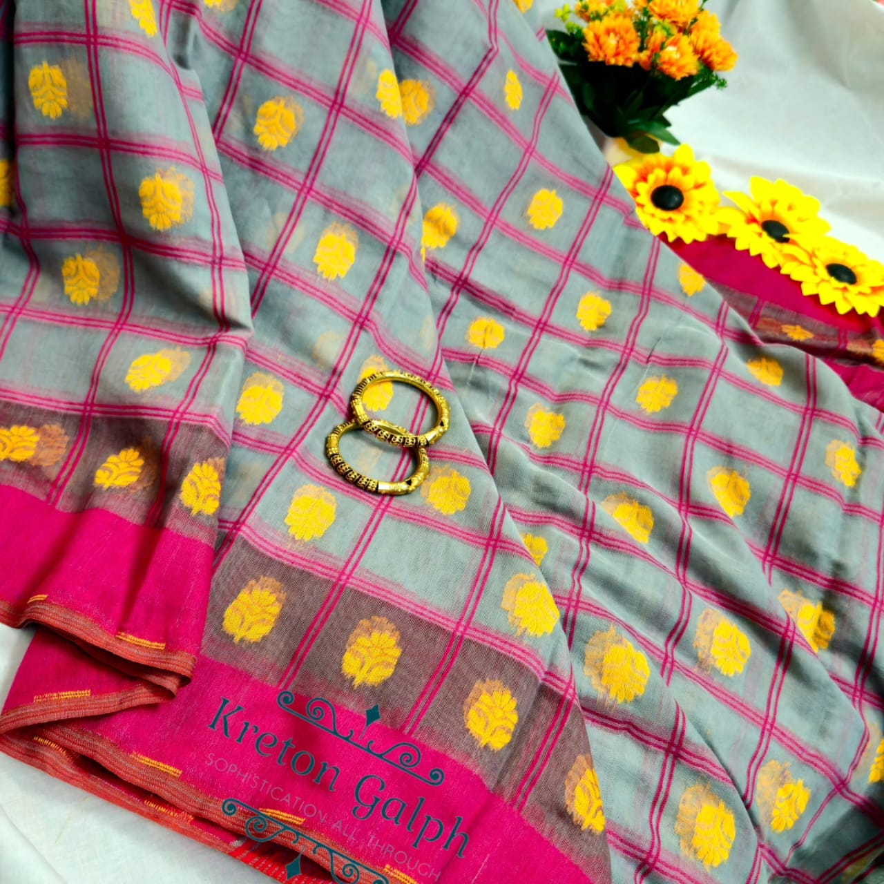 This soft jamdani saree features a soft and lightweight texture,making it comfortable to wear for any occasion.It showcases different motifs such as geometric,figural and floral patterns that ae meticulously woven into the fabric.