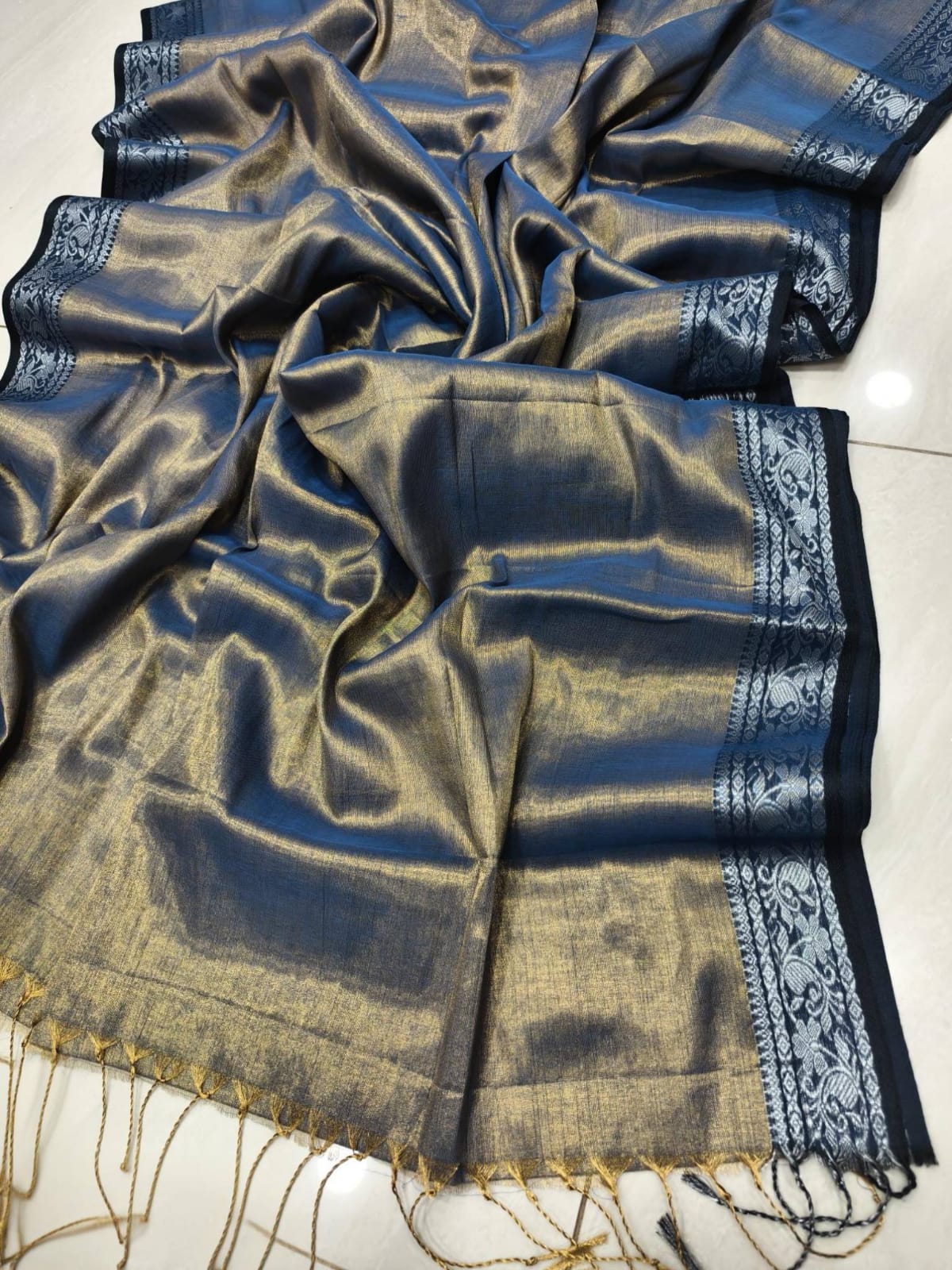 Traditional South Indian Tissue Cotton Saree with a soft, lightweight texture and elegant sheen. Perfect for festive and cultural occasions, offering a graceful drape with timeless charm. Comes with a matching blouse piece.